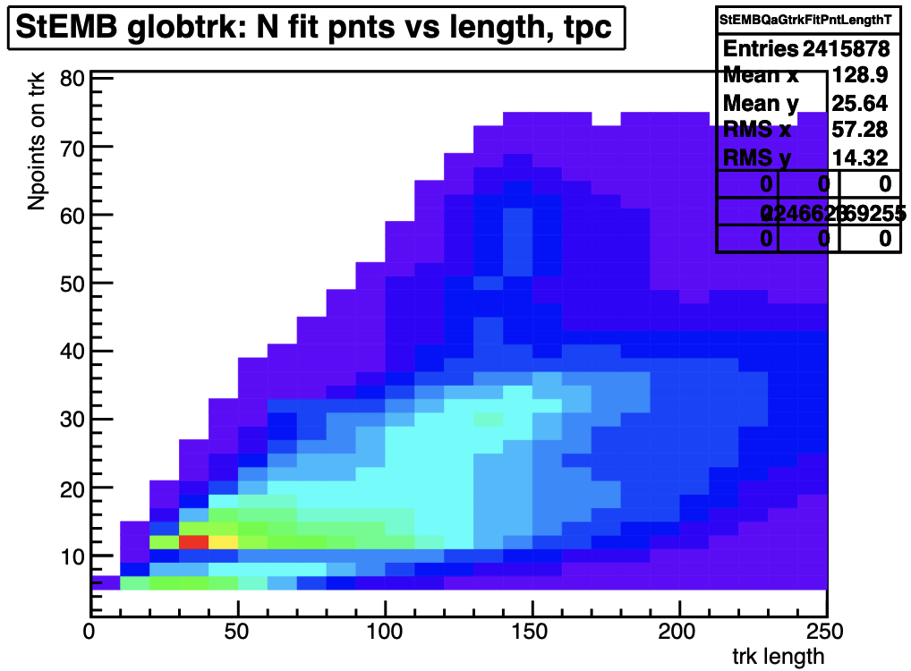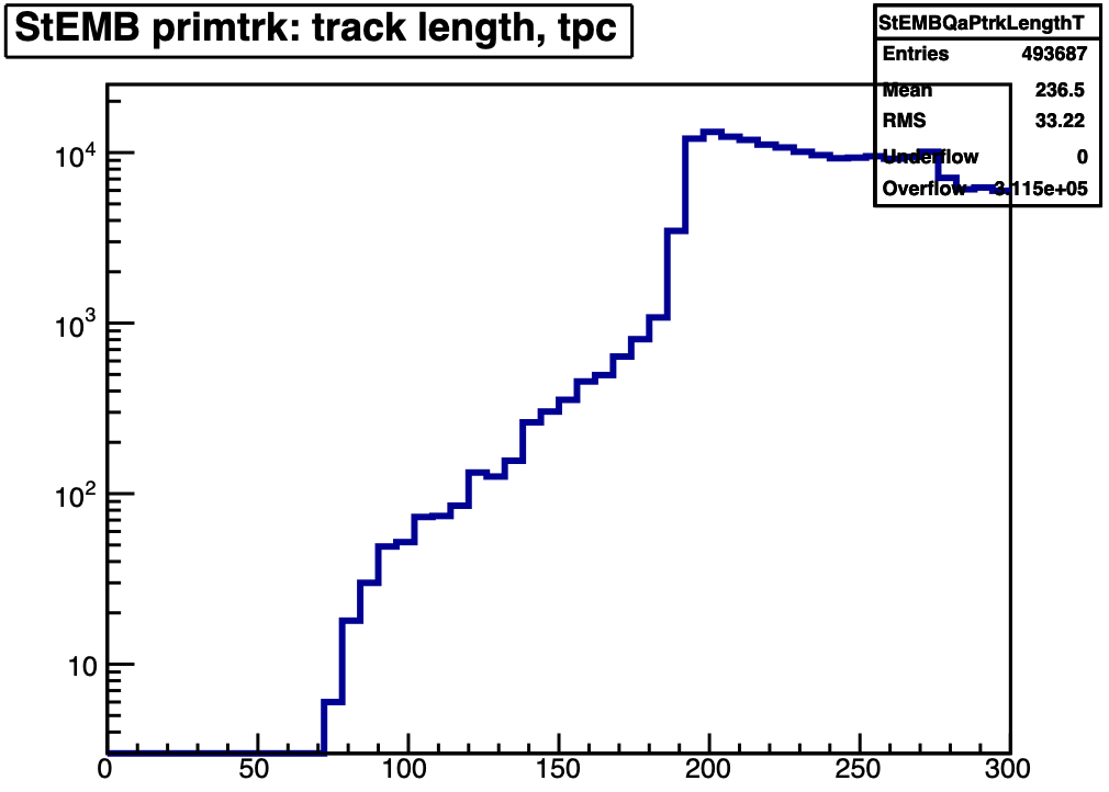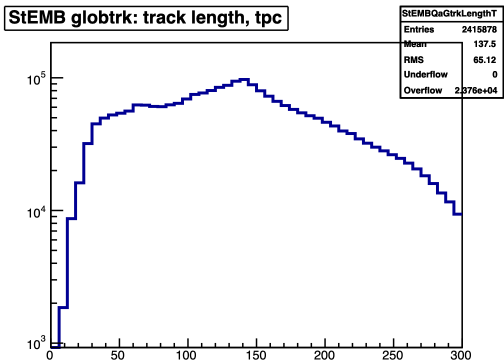 Both global and primary tracks have lengths that extend beyond 300 cm (global tracks are shorter as they don't include the projection to the primary vertex). But it is a bit curious that the long primaries (300+ cm) don't seem to have a large constituency of having >45 TPC hits (it would be helpful if the plot extended further to show even longer tracks).